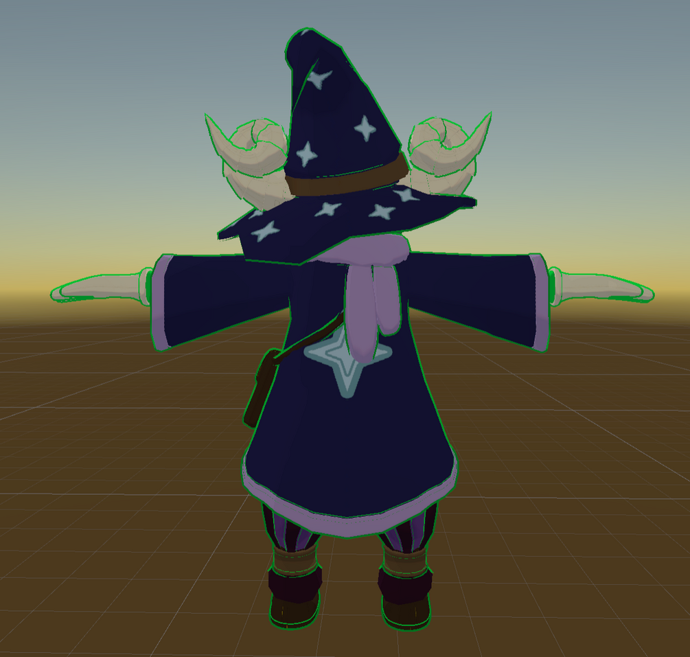 Uses Polyomis outline/toon shader (already set up with a hue shift outline)